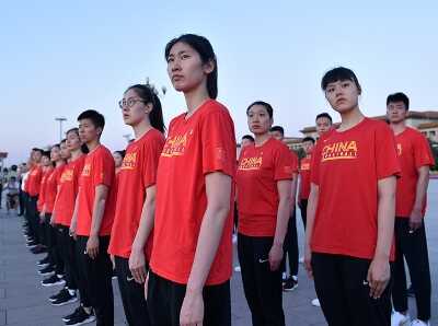 中国女篮、国奥男篮在天安门广场观看升国旗仪式