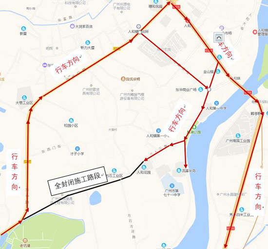 江人三路(方华路口至人和花园对出路段)将实施全路段封闭(沿线单位、住户出入车辆除外),社会车辆可按以下路线绕行:车流从方华路直行至人和聚贤街路口,右转人和聚贤街直行到人和新街,从人和新街右转进入江人三路;或直行至方华公路人和大马路路口,右转进入人和大马路路口,直行至人和大马路人和新街路口,右转进入人和新街直行到江人三路;或人和大马路直行进入G106国道。