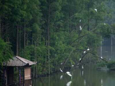 7月6日,成群白鹭在水上森林里栖息,结伴在林间嬉戏,时而凌空翱翔,时而在绿荫葱葱的水上森林边觅食。湖北仙桃梦里水乡景区的水上森林面积300亩,种植池杉20000余棵。林区各种野生鸟类繁多,以白鹭、雁鸭及其他水鸟居多。中新社记者 张畅 摄