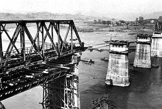 ▶1952年,新中国第一条铁路成渝铁路通车,图为修建中的沱江大桥 (新华社发)