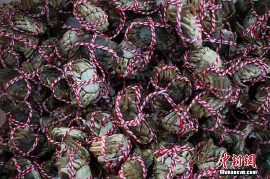 资料图片:一只只张牙舞爪的大闸蟹被捆起来后变得“服服帖帖”。中新社 记者泱波 摄