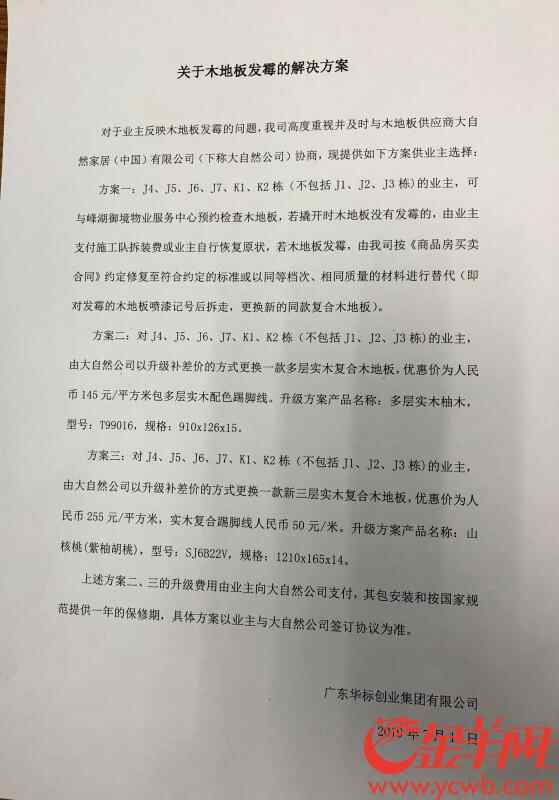 广东华标创业集团有限公司法律及监审中心总监蔡全齐表示,公司十分重视此事,并成立专门小组调查,提供的解决方案是按照合同去处理。“我们提供的第一方案是按合同保修,如果小范围发霉,就把发霉部分更换,如果大范围发霉,就把全部木地板换成新的同款木地板。同时,根据部分业主需求,我们提供第二方案:以较优惠的价格购买升级版本的木地板。如果出现二次发霉现象,在一年保修期内可更换。”