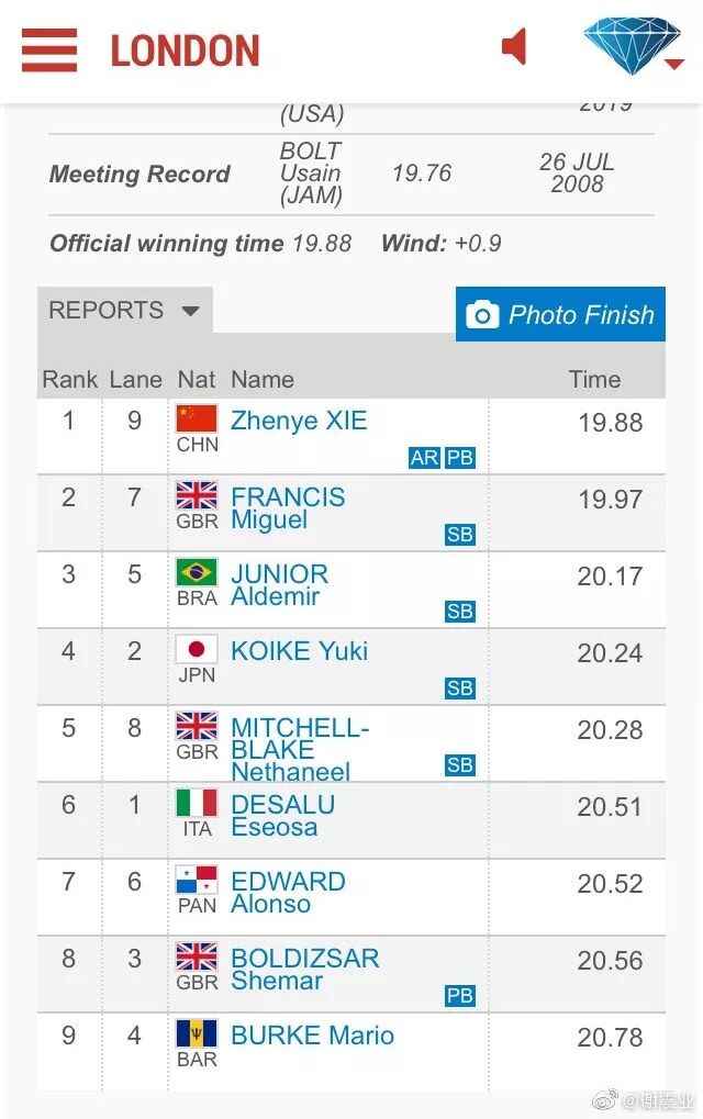 北京时间7月21日,2019国际田联钻石联赛伦敦站男子200米决赛中,中国选手谢震业以19秒88的成绩夺冠并打破亚洲纪录,成为首个男子200米破20秒大关的黄种人选手,同时获得东京奥运参赛资格。