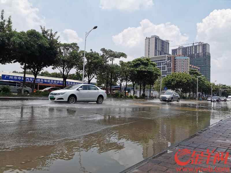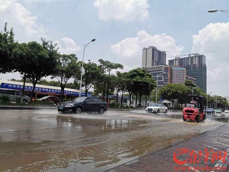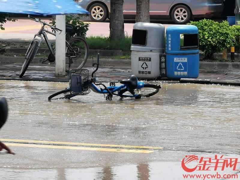 水浸路段长约一公里,该路段南侧靠近广州碧桂园小区出入口,南侧靠近三枝香水道,水深总体不算严重,还没有没过人行道。少部分路段积水较深,附近居民将共享单车临时放置水中,提醒过路车辆慢行,一些路段更为奇怪,出现“阴阳”两色,西侧马路地势较高,路面干爽,东侧路面较低,湿漉漉。