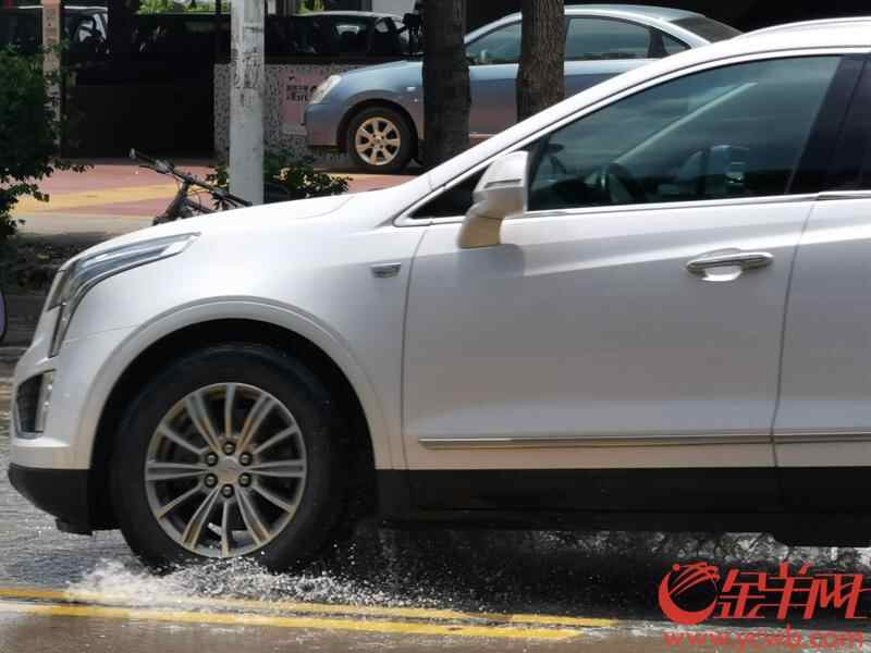 记者近日来到现场,一出南浦站地铁B口便听到车轮带水而过的“哗哗”声,当时正值中午12时左右,大太阳高挂,南桂路却水汪汪。特别马路两侧较低洼处,积水比较严重,车辆经过时,水花四溅,旁边的人行道留下了深深浅浅的水花痕迹。