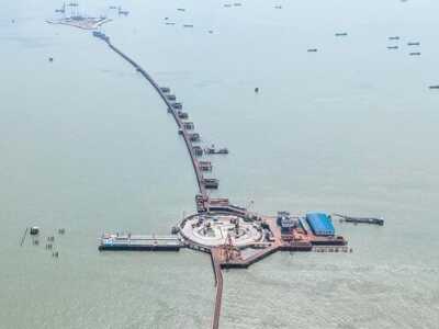 伶仃洋大桥承台施工共需下放4个巨型钢吊箱,预计年底完成全部下放。深中通道管理中心桥梁工程部工程师陈炳耀解释,“钢吊箱好比是承台的‘盔甲’。”有了这层“盔甲”,钢吊箱不仅可有效阻隔海水与桥梁结构接触,还可提高承台及桥梁的耐久性等。