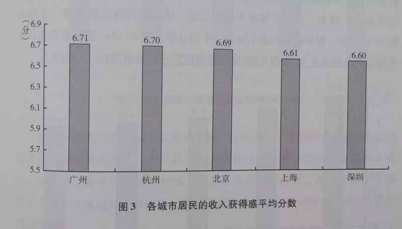 此外,广州蓝皮书还在广州、北京、上海、深圳和杭州5个城市进行了问卷调查。对上述5个城市收入方面的获得感得分统计,结果显示广州市居民的收入获得感平均得分最高,为6.71分。其次是杭州市和北京市,平均分数分别为6.70分和6.69分。较低的是上海市和深圳市,收入获得感平均分数分别为6.61分和6.60分。