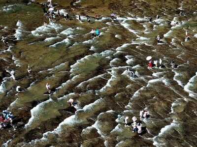 7月25日,空中航拍位于福建省屏南县的天然水上乐园——白水洋。白水洋由平坦的岩石河床一石而就,面积近8万平方米,河床布水均匀,水深没踝。在阳光下,水面波光粼粼。每年夏天,白水洋都吸引大批游客前来戏水玩乐。中新社记者 王东明 摄