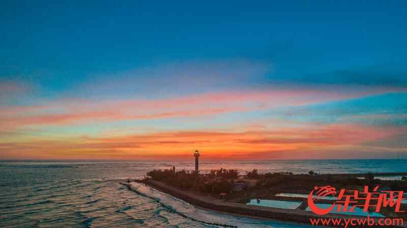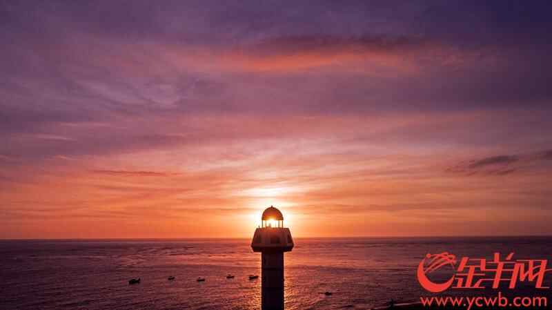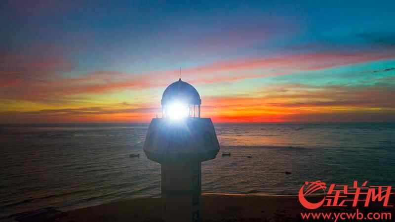 斜阳夕照,彩霞满天。灯楼角及海那边都披上了金灿灿的衣衫。回首顾盼,远处是辽阔的北部湾,波光潋滟,舟楫点点。近处,云舒霞卷之下的灯塔,寂立凝视于海岸,在万丈霞光的映照下,显得格外的轩峻与光亮……