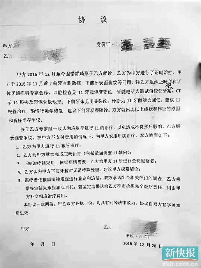 刘小姐称,2018年12月28日,她与省口腔医务科文医生协商,院方表示愿意先帮她治疗,并拟写了一份协议。新快报记者从刘小姐提供的协议中了解到,院方当时愿意先搁置争议,在刘小姐不支付费用的情况下为她安排后续治疗,其中包括11牙根管治疗、正畸治疗、11牙全瓷冠修复等。双方按照法律规定鉴定和追查医疗责任,双方承诺配合相关部门的调查,乙方(医院)根据鉴定结果承担相应责任。若鉴定结果认为乙方不需承担完全医疗责任,则由甲方(患者)补交相应医疗费用。