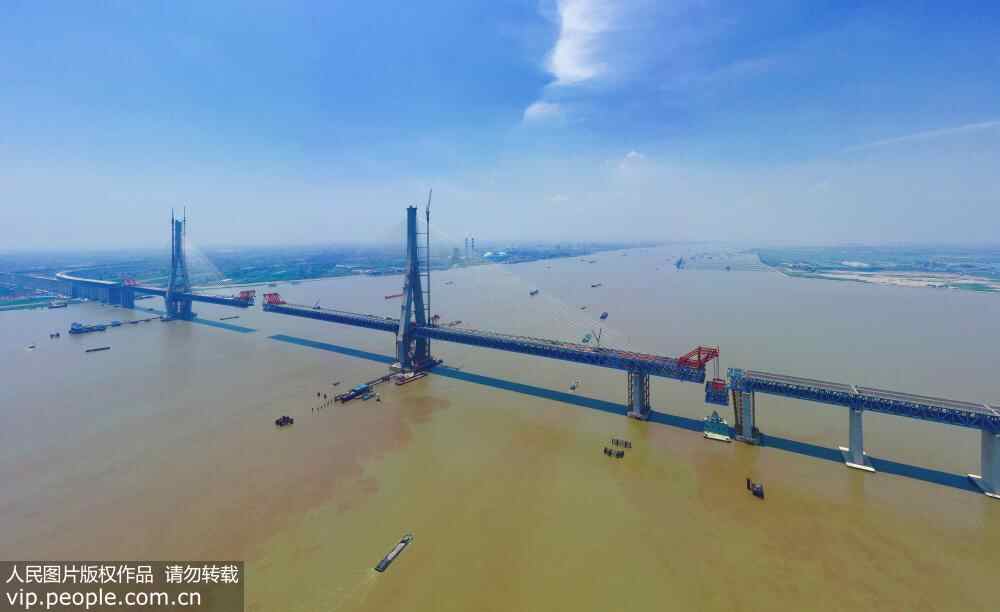 2019年7月29日,沪通长江大桥主航道桥北跨段成功完成最后一次双悬臂钢梁吊装作业。