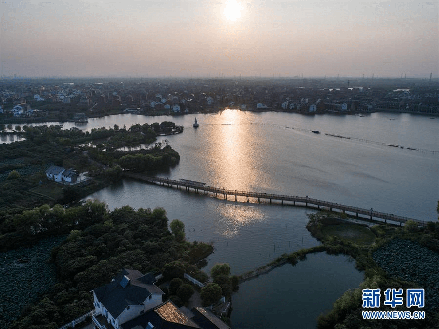 8月7日,空中俯瞰塘栖镇丁山湖边的水上栈道,丁山湖水域面积500多亩,是塘栖镇中最大的湖泊湿地(无人机拍摄)。新华社记者 徐昱 摄