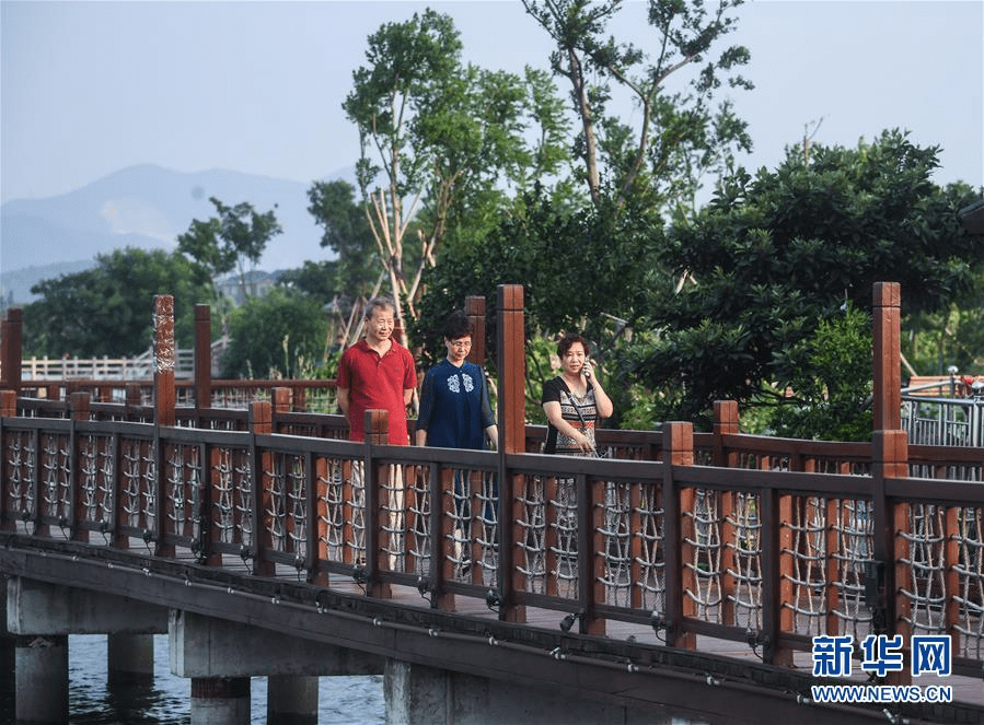 8月7日,百姓在塘栖镇丁山河村新建的水上栈道上散步休闲。新华社记者 徐昱 摄