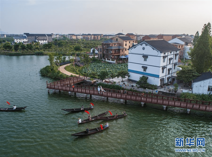 8月7日,塘栖镇丁山河村的百姓乘坐小船观看在新建水上栈道上举行的传统社戏演出,这也是当地夏季乡村文化活动之一(无人机拍摄)。新华社记者 徐昱 摄