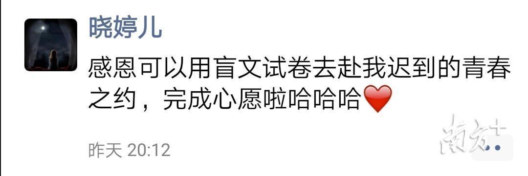 6月8日结束高考后,杨晓婷发布了第一条朋友圈动态:“感恩可以用盲文试卷去赴我迟到的青春之约,完成心愿啦!”