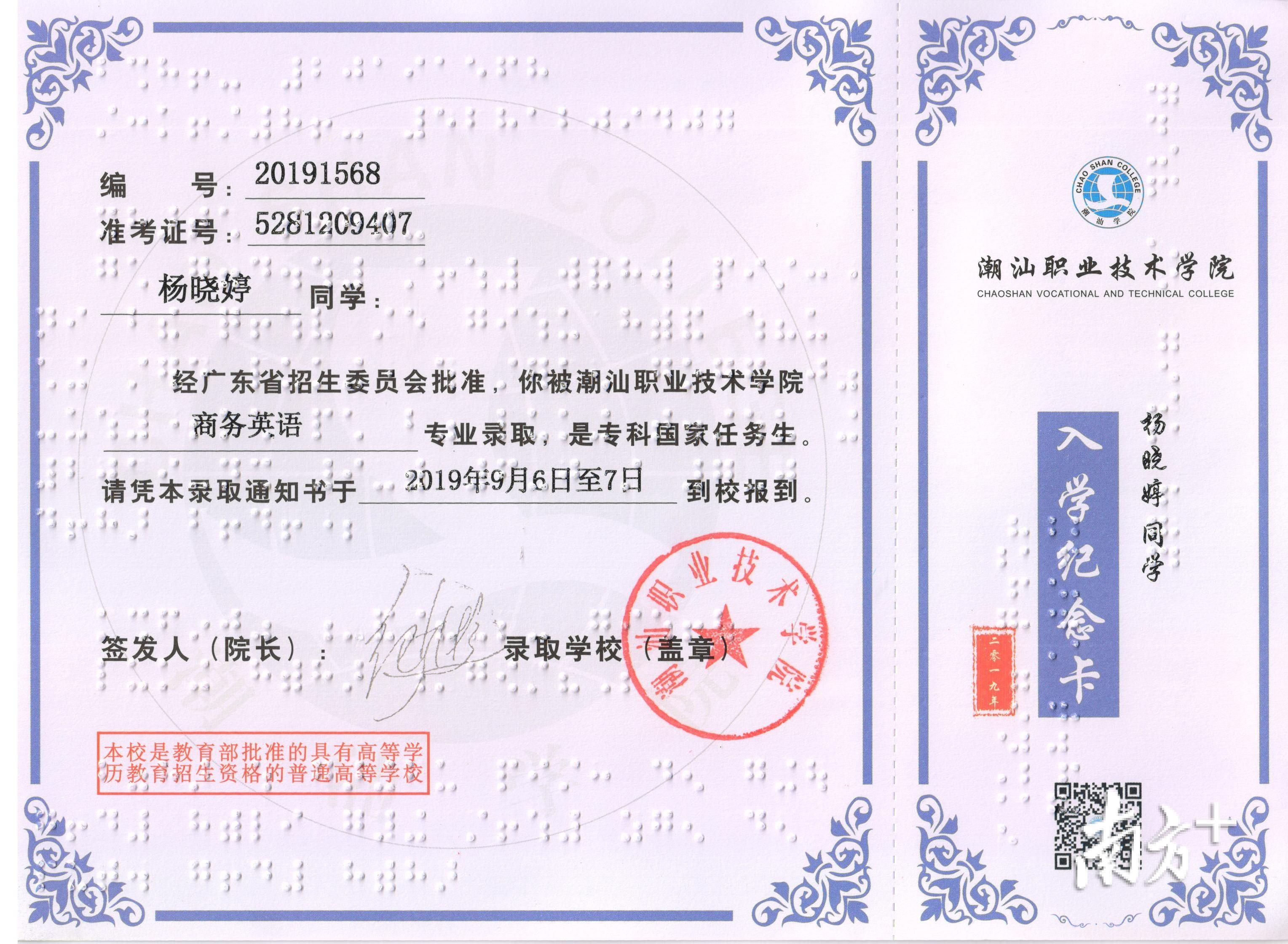“从准备参加高考到现在,一路充满了爱和惊喜,盲文录取通知书将是一份特别的礼物。”杨晓婷说,她对大学生活充满期待,潮汕职业技术学院将是她梦想开始的地方。无论看不看得见,她都要用奋斗点亮自己的青春。