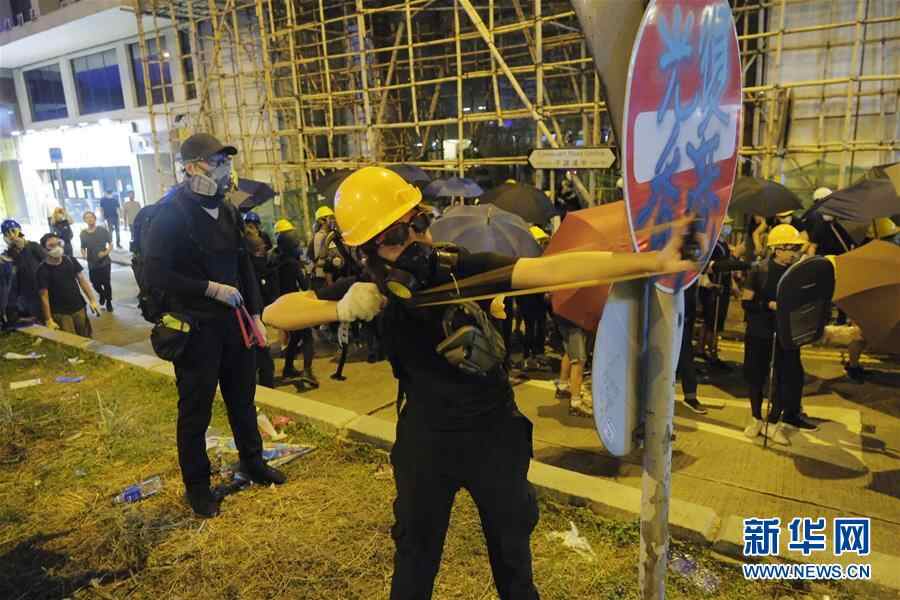 7月28日,在香港上环,暴徒使用弹弓攻击警察。两个多月来,不断升级的违法暴力已让香港社会付出沉重代价。暴徒破坏公物、堵塞干道、阻挠通勤甚至打砸纵火,不定时、不定点地四处闹事,把香港搅得乌烟瘴气、人心惶惶。香港正面临回归以来最严峻的局面,当前最急迫和压倒一切的任务,就是止暴制乱,恢复秩序,共同守护我们的家园,阻止香港滑向沉沦的深渊。新华社发