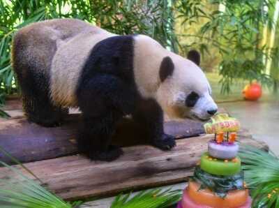 8月18日,海南热带野生动植物园的大熊猫兄弟“贡贡”和“舜舜”迎来了6周岁生日,这是它们在海南度过的第一个生日。图为大熊猫“贡贡”吃特制的冰“生日蛋糕”庆生。中新社记者 骆云飞 摄