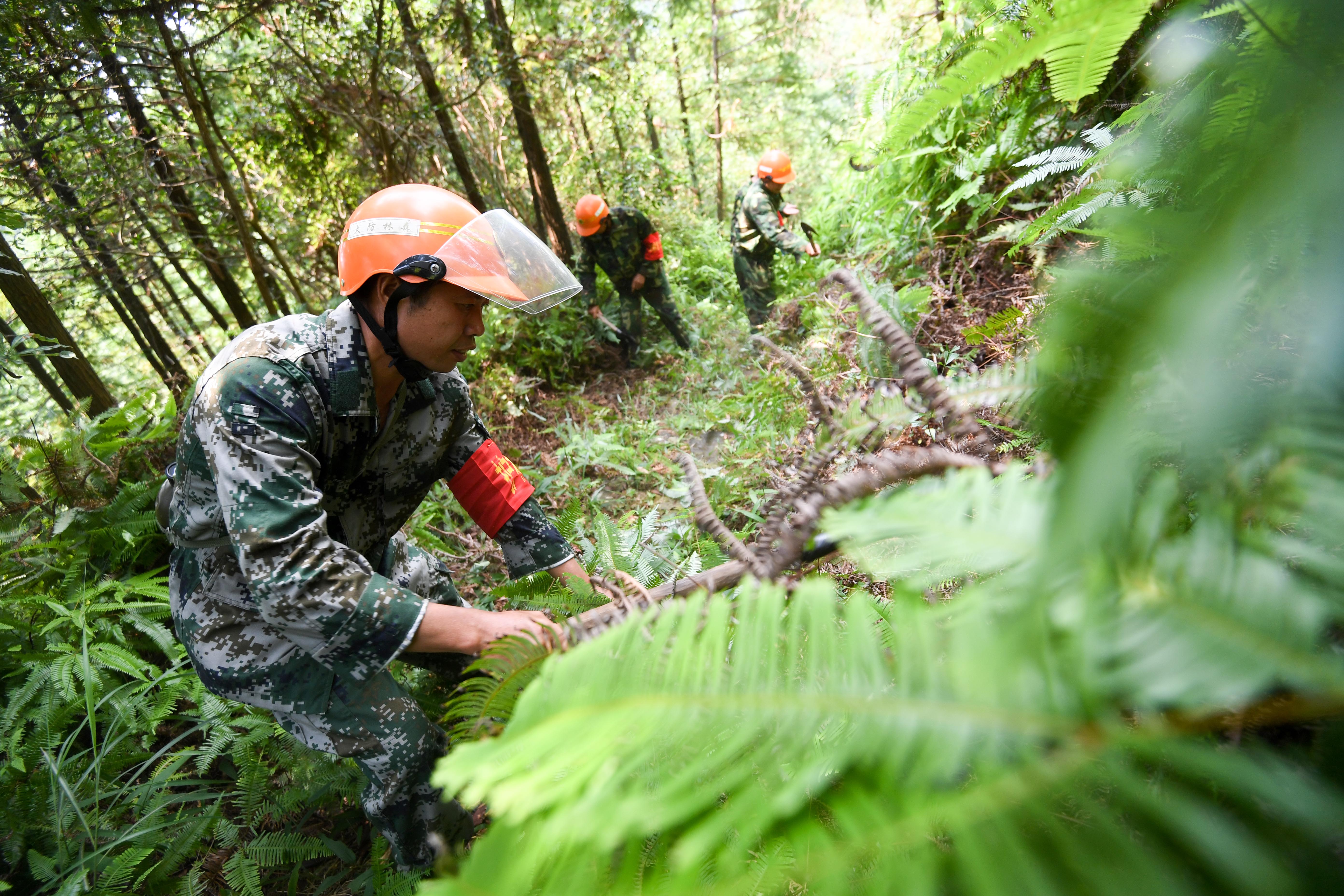↑护林员在山林间巡逻时清除杂草(8月18日摄)。