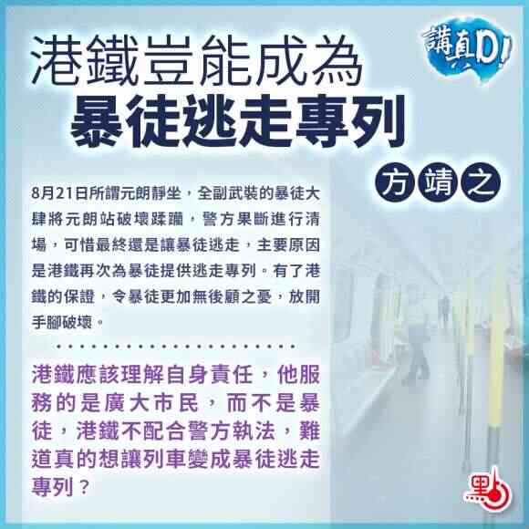 对待暴徒的破坏行径,港铁不可能没有预料到,但还是开启车站闸口,任由暴徒自出自入,而且也不及时报警,最后还免票护送离开。这不禁让人想到此前港铁一名车长通过车上的广播系统,呼吁参加乘客注意安全,坚持反对修例,“代我去游行”。港铁这样的态度,非常值得玩味!非常不够鲜明!非常令人担忧!