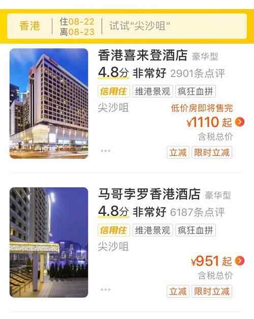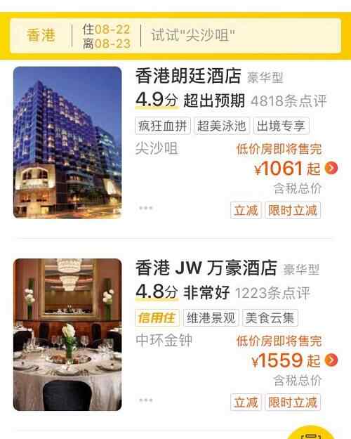 每经小编今日查询部分旅游预订平台发现,以往旺季价格可达3000元一夜的尖沙咀马哥波罗酒店现在价格为不到1000元一夜。原本要数千元一夜的香港朗庭酒店现在仅为1000元出头,JW万豪酒店目前价格也仅为1500元左右,香格里拉酒店最低价格也在1350元/晚。