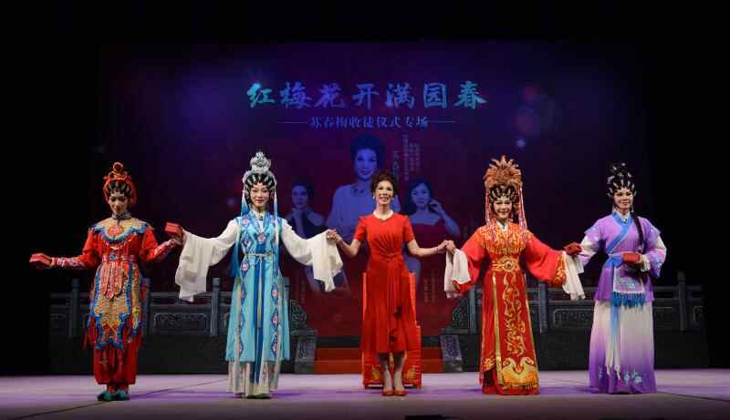 据悉,《红梅花开满园春——苏春梅收徒仪式专场》是苏春梅举行的首次收徒仪式。本次拜师活动由广州市文化广电旅游局、广州市振兴粤剧基金会指导,广州粤剧院、红线女艺术中心主办,广州红豆粤剧团承办,春梅艺术工作室、广东八和会馆协办。