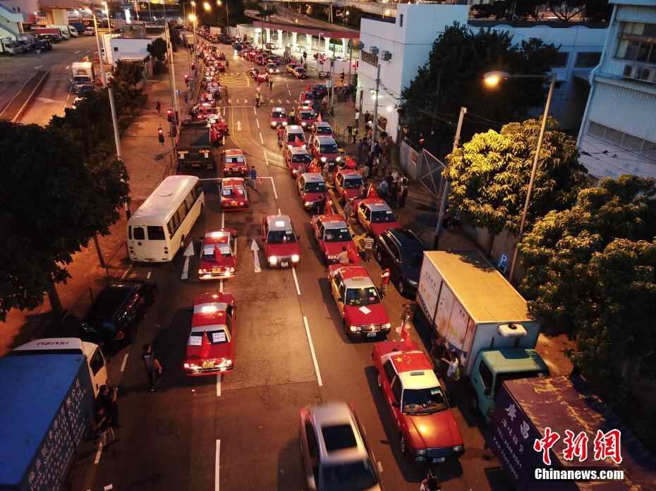 晚7时许,超百部的士挂上五星红旗,贴上“我爱香港”“我爱中国”海报聚集西环,整装待发,围绕港岛区主要道路行驶。中新社记者 李志华 摄