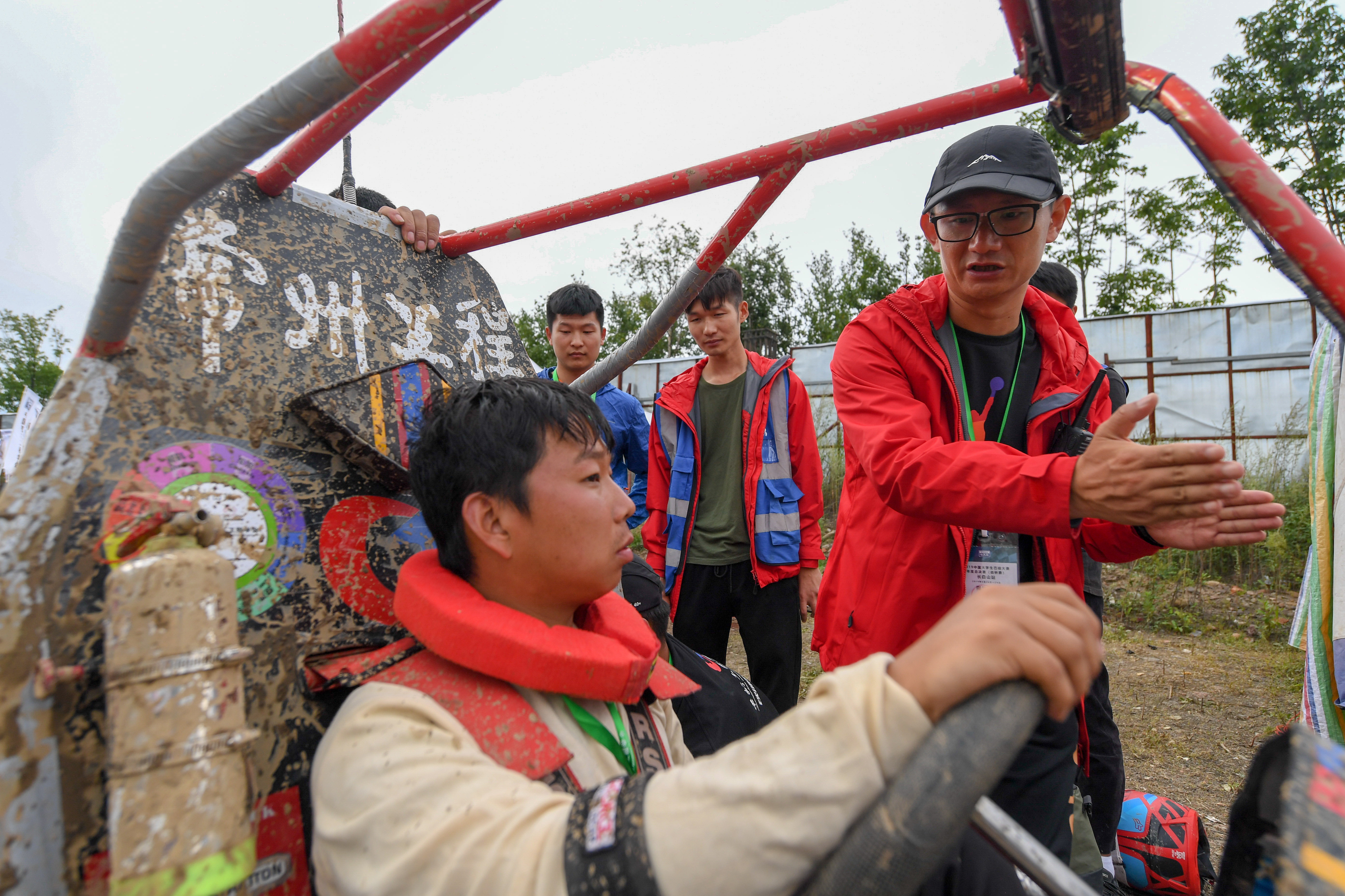 ↑图为常州工程职业技术学院代表队指导教师王中磊(右一)为车手讲解比赛线路(8月28日摄)。