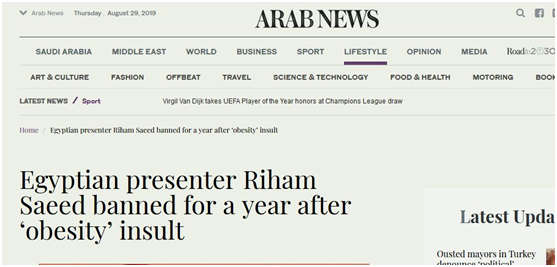 综合“阿拉伯新闻”(ArabNews)与《中东箴言报》29日报道,在早些时候的一档深夜节目中,埃及女主持人蕾哈姆称,超重的人是社会的坏形象,许多肥胖者是“家庭与国家的负担”。她还称,随着时间的推移,超重的女性会失去她们的女性气质,变得缺乏快乐。