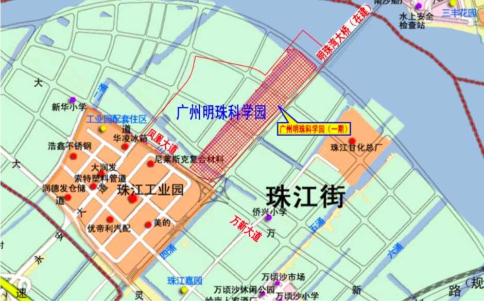 从公布的图示看到,该项目片区城市道路交通发到,主要为凤凰大道与明珠湾大桥(在建),凤凰大道是南沙区南北联系的主干道之一,向北可联系横沥、蕉门河、庆盛区域,向南可快速连至万顷沙区域;明珠湾大桥为在建项目,未来将成为连接蕉门河与南沙湾地区的重要通道。而且周边现状水网密布,水运发达,处于凫洲、龙穴水道与蕉门水道的交汇区。