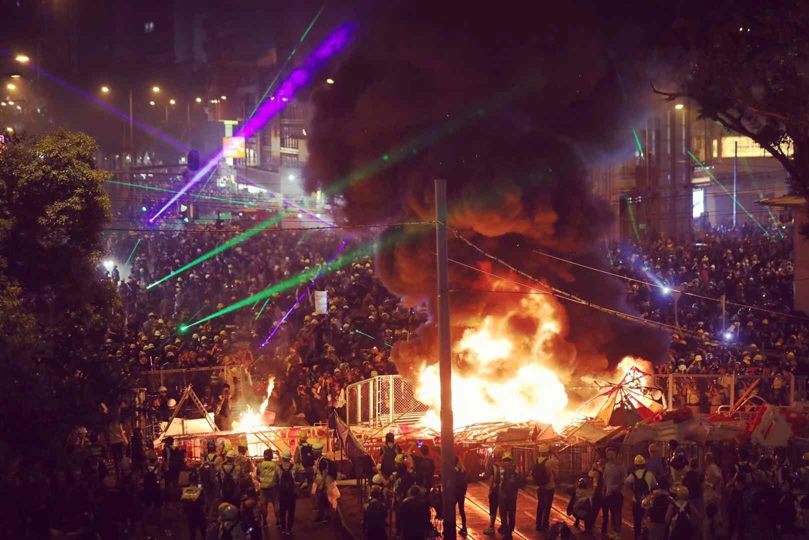 发言人表示,激进示威者在多区与警方对峙,向特区政府总部、立法会大楼、警察总部及多处投掷多枚汽油弹,并用腐蚀性液体及砖头等袭击警务人员。此外,激进示威者在多处纵火、破坏公物、架起路障、破坏港铁车站月台幕门等设施。轩尼诗道的火势一度十分猛烈,非常危险。