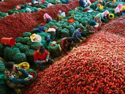 300多名农民工正在精选采摘的辣椒,火红的辣椒堆积如山,映红了农民的笑脸,现场一派热火朝天的繁忙景象。