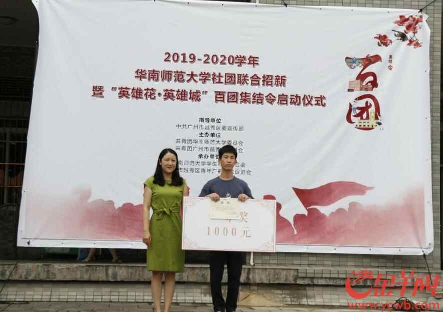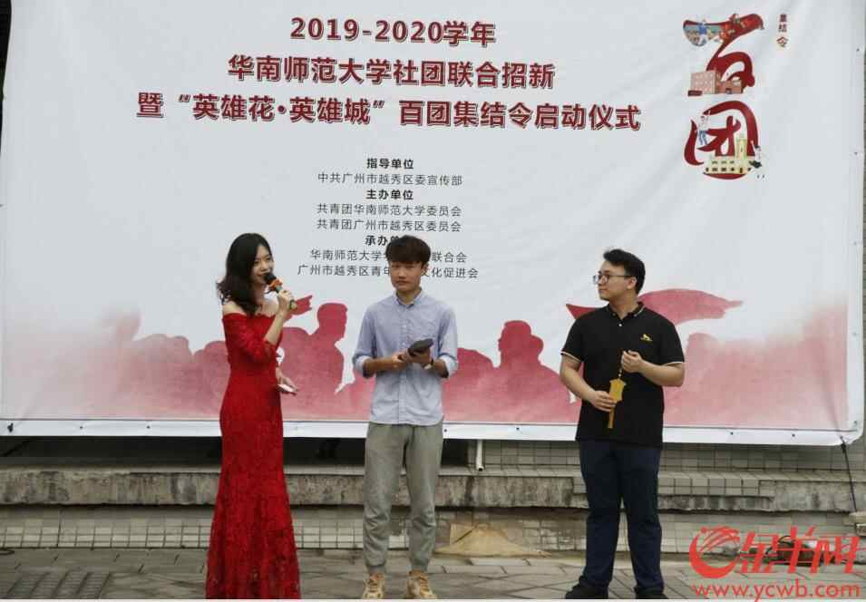 9月16日上午,由中共越秀区委宣传部指导,共青团华南师范大学委员会、共青团广州市越秀区委员会主办,华南师范大学学生社团联合会、越秀区青年广府文化促进会承办的“英雄花·英雄城”百团集结令启动仪式在华南师范大学大学城校区翰园广场顺利举行,“英雄花·英雄城”百团集结令正式启动。