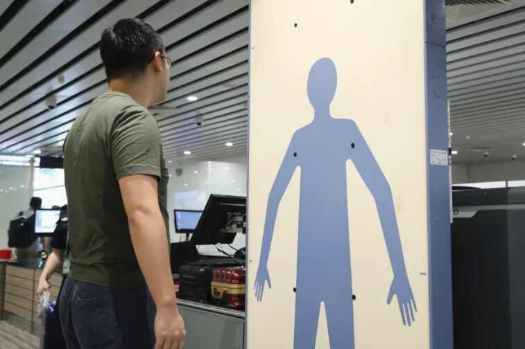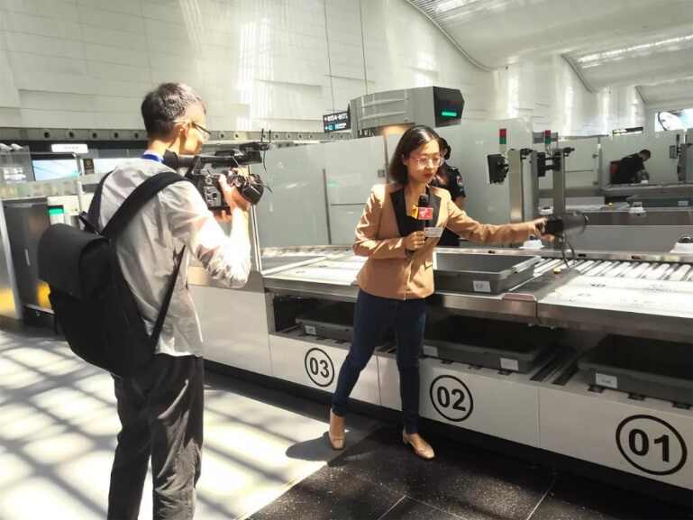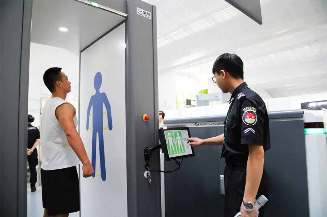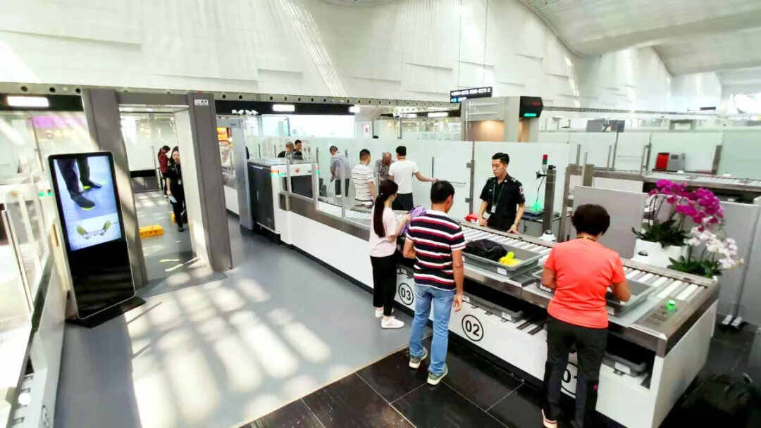 旅客进入通道自取篮筐,将随身行李和物品放入通过 X射线机检查;自行选择通过毫米波安全检查仪或金属安全门检查,经仪器自动扫描判别或人工排查后,通过安检。