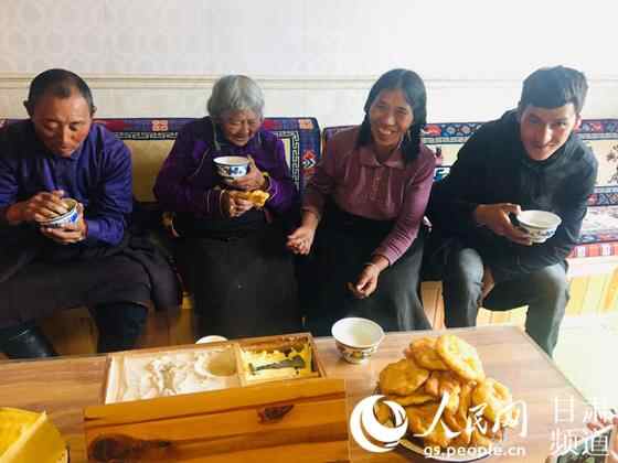 扎西东知(右)和家人在新房一起喝着热乎乎的奶茶。(王彤 摄)