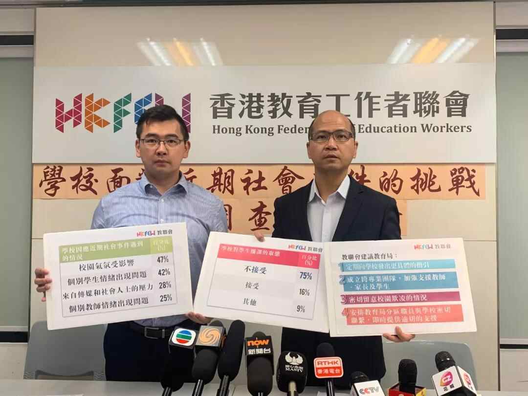 教联会于9月初向全港中小学发出问卷,一周内收到168所学校的回复,其中89%的学校表示过去一周内没有学生参与罢课,3/4的学校或办学团体称不接受学生罢课。不过,由于近期发生的社会事件,近半数校长表示校园气氛受到影响,有校长反映自身受到来自媒体和社会人士的压力,校园日常教学受到干扰。“教联会反对将政治带入校园,故不赞成学生参与罢课,亦呼吁有关人士停止校外筑人链的行为”,教联会主席黄锦良19日在调查问卷发布会上表示。