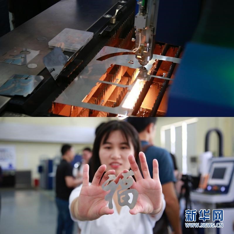 拼版照片:上图为宏石激光研发的敞开式光纤激光切割机正在对金属板材进行切割;下图为切割好的“福”字。新华网 朱皓 摄