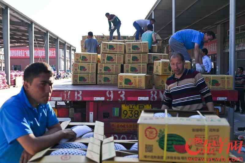 原来,这些西瓜每装满一车就会送到疏附县的疆南农批市场,最终由货运卡车送到广州赫赫有名的江南水果批发市场。