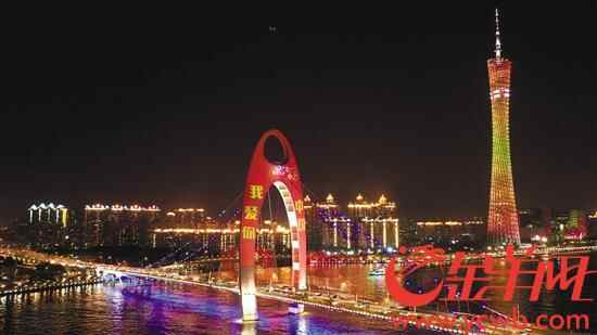 昨日傍晚,华灯初上的广州猎德大桥和海印桥率先亮起了与以往不同的绚丽灯光,“我爱你中国”标语格外抢眼,展现着广州70年间快速发展的城市形象。海珠广场包括广州宾馆在内的6栋建筑都打上了“中国红”加上从江湾桥看过去的24栋建筑立面,附近区域夜空“爆红”。