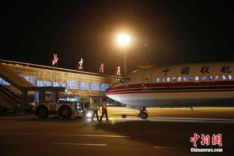 9月25日晚,工作人员在南苑机场送别最后一个商业运行航班KN5957航班。当晚,中国联合航空最后一架位于南苑机场的调机飞机计划于22:40起飞。这一举动,标志着中国历史上第一座机场,已经109岁的南苑机场正式结束民航运营。 中新社记者 殷立勤 摄