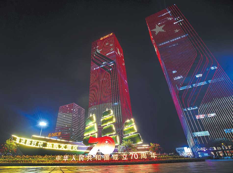 万达广场的“奋进新时代扬帆大湾区”光彩夺目 江门日报记者 周华东 摄