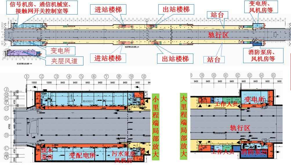 地下站台层(标高-9.10m),2台四线,线侧式站台 (站台尺寸450X8)。中部设进出站楼扶梯,两端设设备用房。站台层层高5.50m。