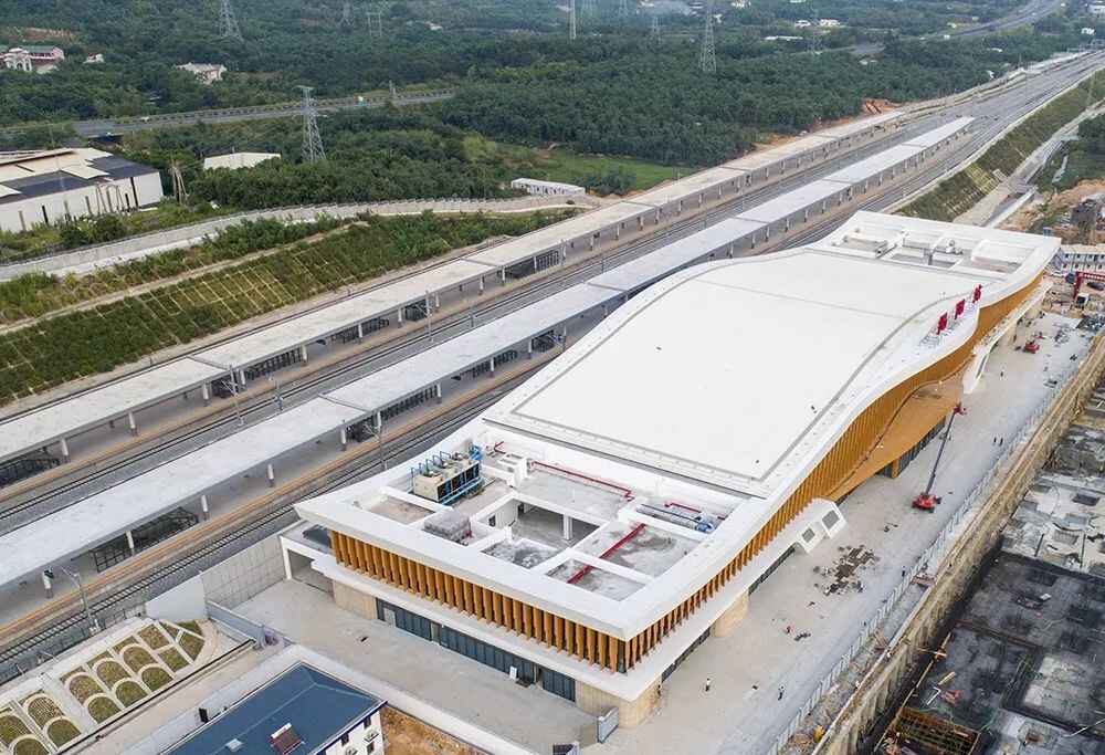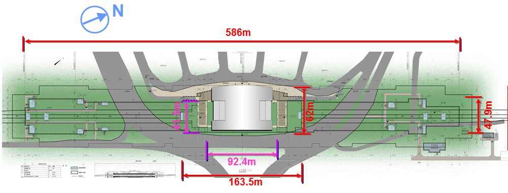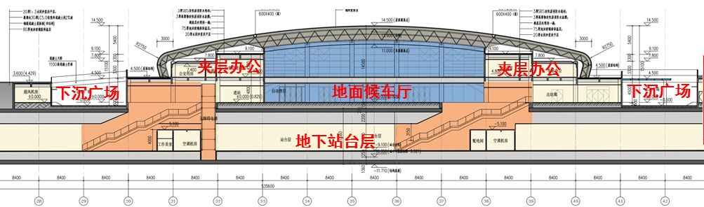 据项目承建方负责人施周烈介绍,车站总面积33999.1 ㎡,站房呈东西向布置,其西、南、北三面均设下沉广场。站厅位于站台上方,通过楼梯、扶梯直接进出站。本站为地下站,站台位于地下,站厅位于地面,设2个侧式站台,4股道。站房候车、进出站厅等布置于站场上方,采用线正上式布置。