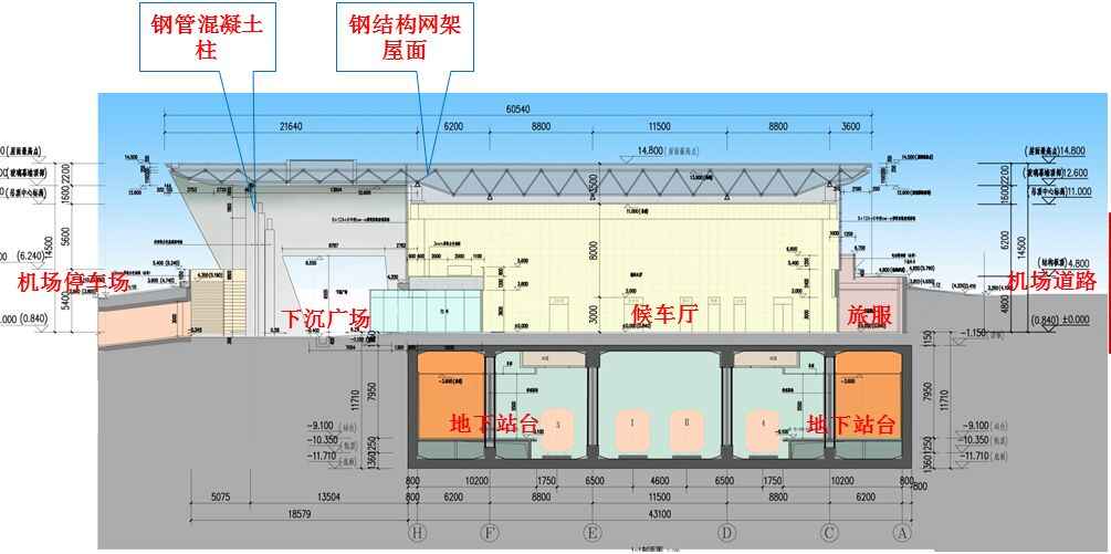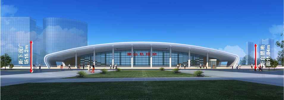 建筑高度15.2m(檐口最高点至下沉广场地面高度),建筑地上首层室内地面距屋面最高点14.8米,檐口最高点距室外自然地面11.84米。站房的±0.000标高相对于绝对标高(国家85高程)0.840m。