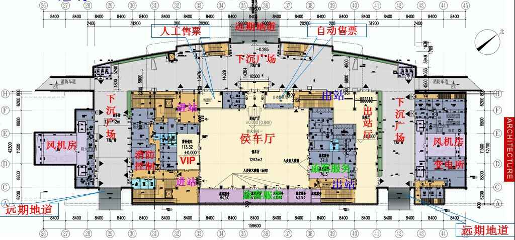 一层(标高±0.00m)为候车厅、售票厅、出站厅、旅客服务、变电所、消防控制室、售票办公、公安值班、间休房屋及部分设备用房等;