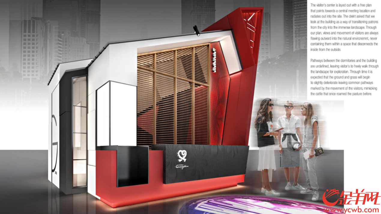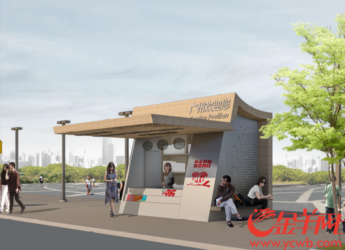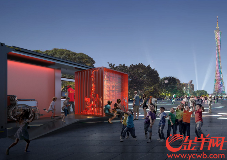 该设计像一个“礼物盒”,从木棉花、西关大屋和定位图标等元素中获得灵感,呈现出一个独具广州特色的驿站,作为一个信息传达和功能服务的载体,是呈献给这座城市的礼物,也是广州献给世界的礼物。从功能上,是城市名片、拍照景点、一代人的记忆点,或是人们交流、互动的空间场所。建筑一侧用于多媒体信息的宣传;另一侧抽取了传统建筑中花窗的元素,屋顶上将传统建筑中的烟囱转化成一个会发光的爱心标志,在城市中指引和定位坐标。