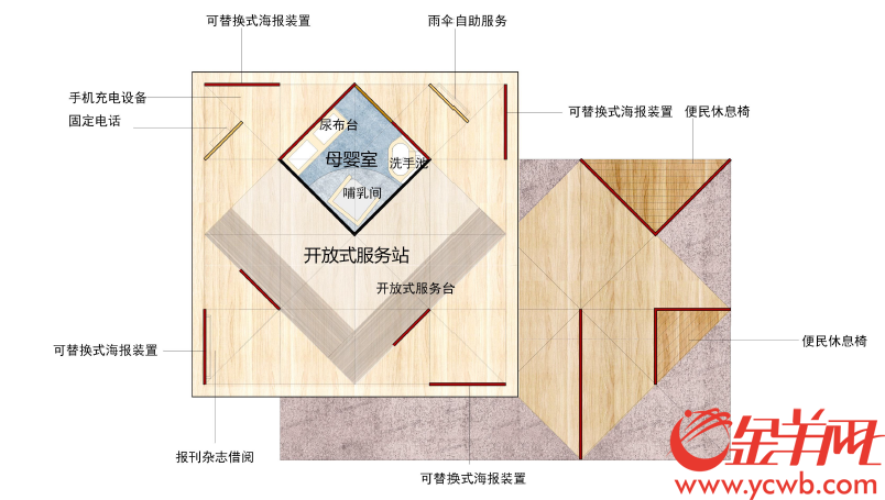 守驿台,即“志愿者坚守驿站服务”。该设计彻了模块化、可变形、易安装、绿色环保的理念,符合城市定位,外观优雅且易于识别。功能方面,满足市民对便民服务、公共服务、智能化服务的需求,根据市民日常需要,配备雨伞、地图、医疗箱、塑料凳等常用设施。整个驿站的材料选择主要为木质,部分增加一定的木格栅,能够有效地防止阳光的暴晒,同时,木格栅的使用也是的这个设计看起来更加的清新大气。