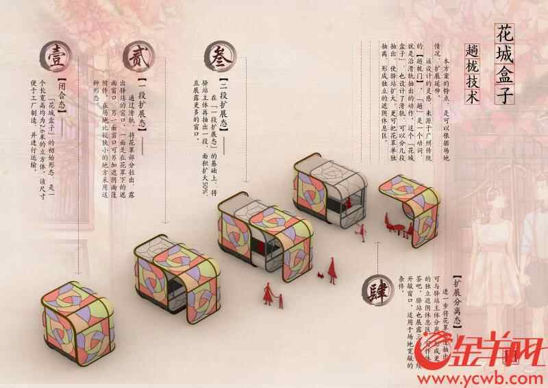 该设计蕴含岭南花格窗、彩色玻璃满洲窗等传统建筑元素,以现代的花瓣形曲线形体进行时尚的演绎。本方案的特点,是可以根据场地情况,扩展延伸,设计灵感来源于广州传统的趟栊门,通过滑轨可以分几段抽出使驿站扩大;更可把花罩单独抽离,形成独立的遮阴休息区。醒目的立面,时尚的造型,必将成为“广州新地标,网红打卡点”。