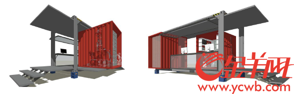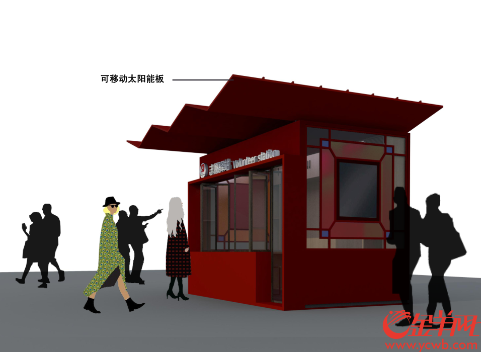 整个建筑的造型在岭南建筑特色的基础上进行提取,提取满洲窗做成立面,做成岭南建筑的一个小缩影,把古建筑用现代材料表现,碰撞出时代的火花。整个建筑利用装配式的模式,移动方便,维护方便,可重复利用建筑材料,达到利用最大化。屋顶做成可移动的太阳能光板,可以供应一定的电量给驿站用电。当屋顶移出,可作为遮阳板,可以为途人提供一个避阳遮荫的地方。在侧面与背面,设立LED屏幕,播放海报内容,也提供自助咨询的页面,为人们提供更好,更方便的服务。室内主要提供收纳的空间和舒适的工作环境。