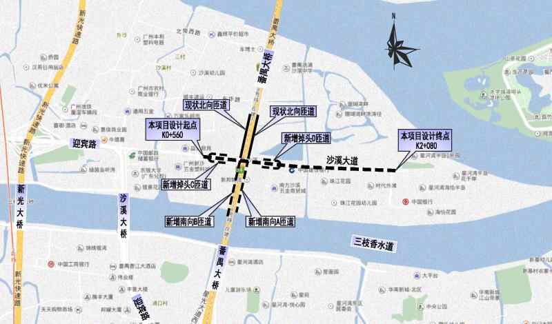 另外,番禺大桥新增南向匝道工程,起于沙溪大道,增设南向上、下两条与番禺大桥平行的单向单车道匝道与番禺大桥顺接,配套设置收费站2座(含相关设备)。